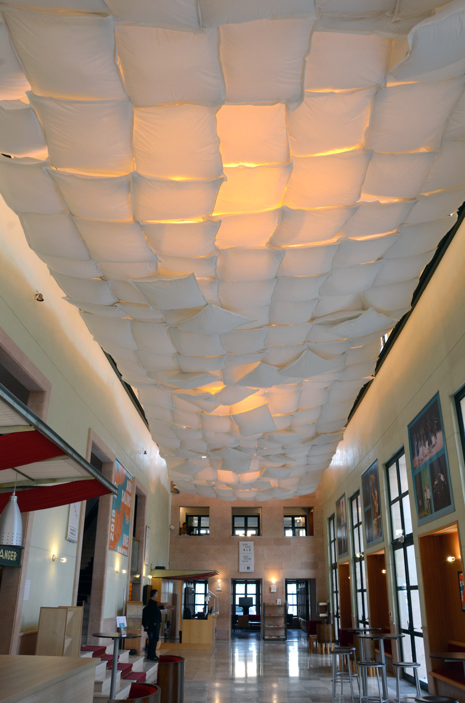 Remy Uno a investit le théâtre avec une œuvre monumentale. Il a habillé le plafond du hall avec une installation plastique surprenante.