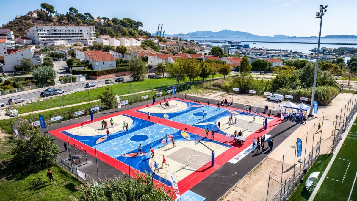 À L’Estaque, quartier emblématique de Marseille, Lartmada a développé une approche plus contextuelle encore. Le terrain de basket s’inscrit dans un environnement urbain et paysager fort, et la peinture au sol dialogue avec cette identité singulière.